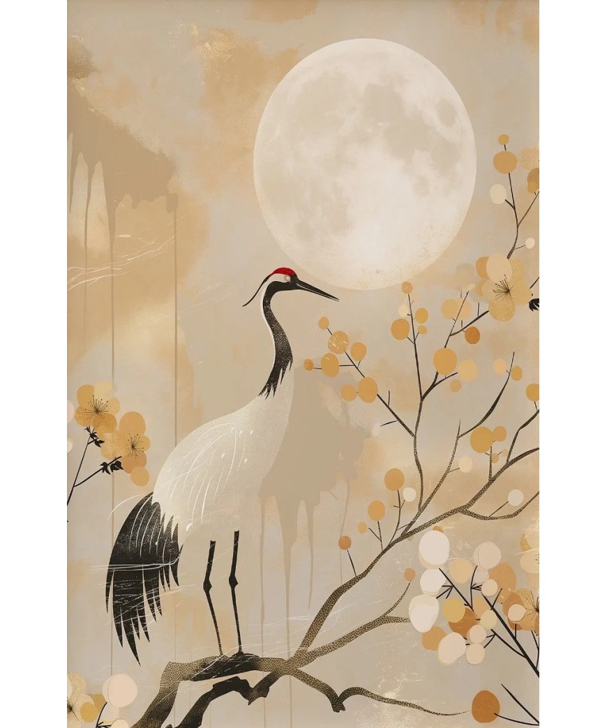 Sublimez votre intérieur avec cette affiche murale au style Wabi Sabi minimaliste. Alliant des tons beige et or, cette toile haute qualité représente une grue majestueuse en plein vol, symbole de longévité et de paix. Une décoration murale élégante et apaisante, idéale pour un salon ou une chambre à coucher à l'esprit zen.