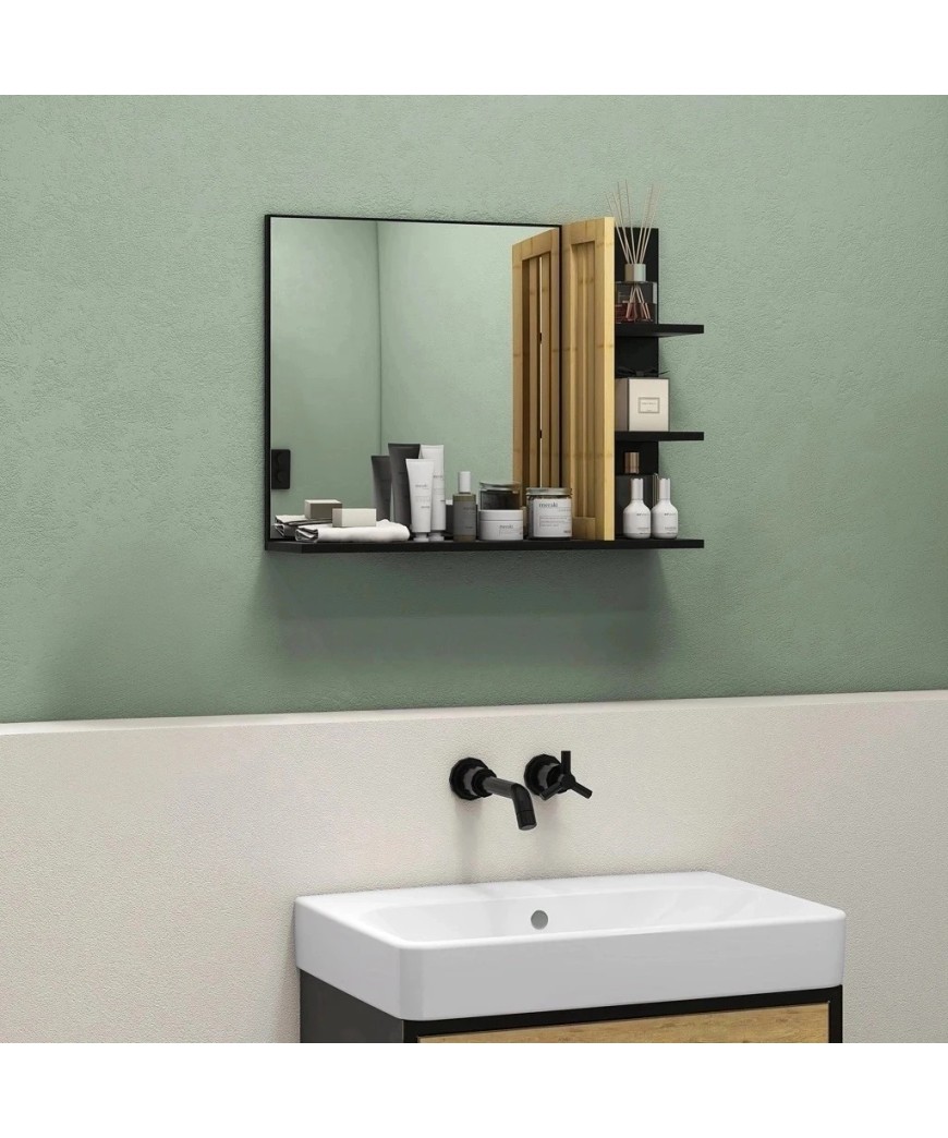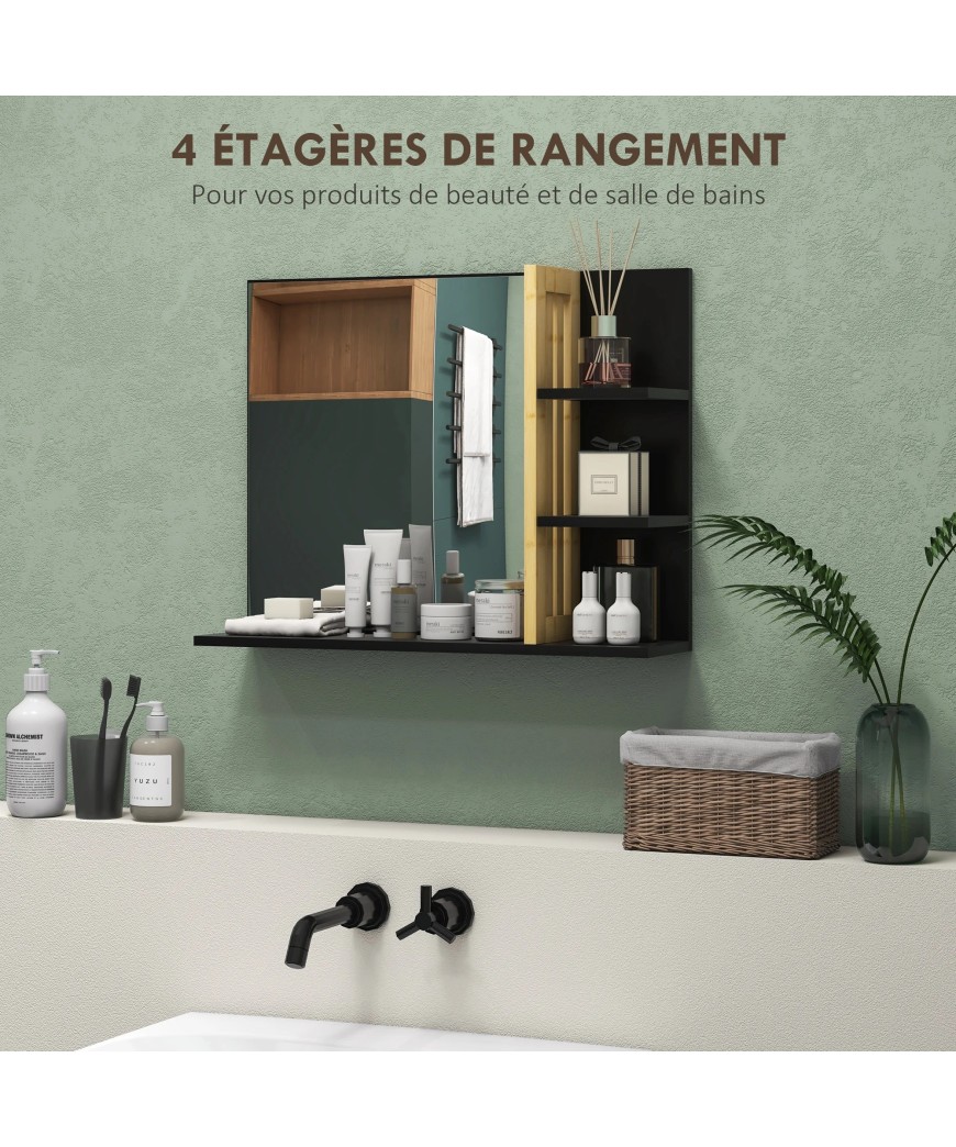 Alliez l'utile à l'agréable avec ce superbe miroir mural conçu pour les espaces modernes. Doté d'une finition noire élégante et de touches en bois de bambou naturel, il offre un grand miroir central accompagné de quatre étagères pratiques. C'est la solution gain de place idéale pour organiser vos produits de beauté, vous maquiller ou vous raser en ayant tout à portée de main.